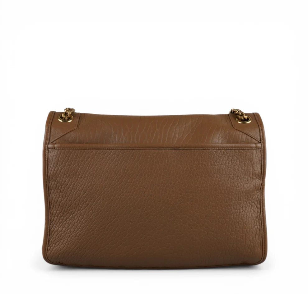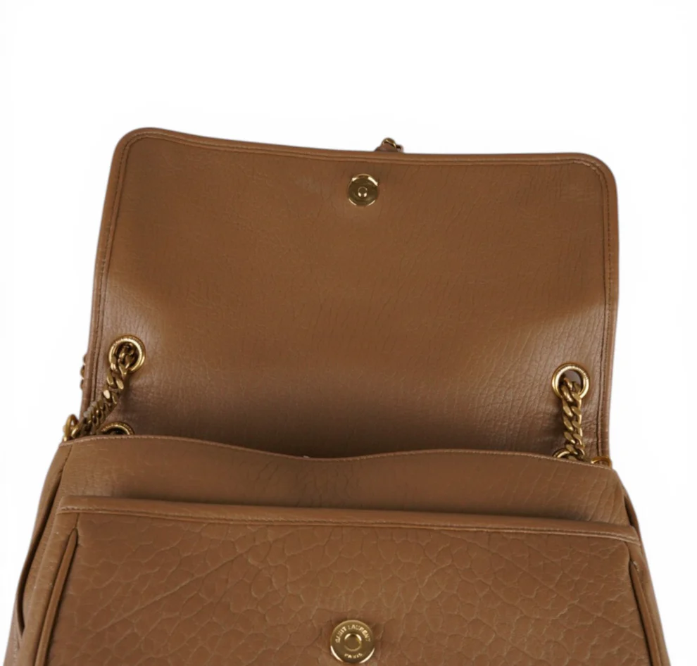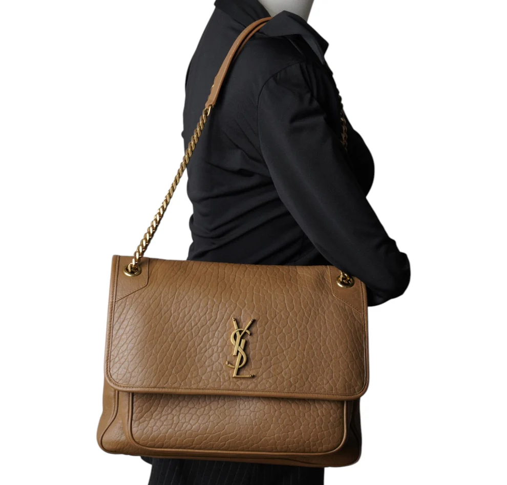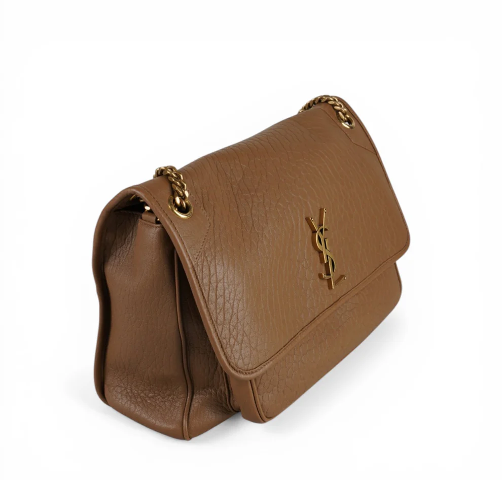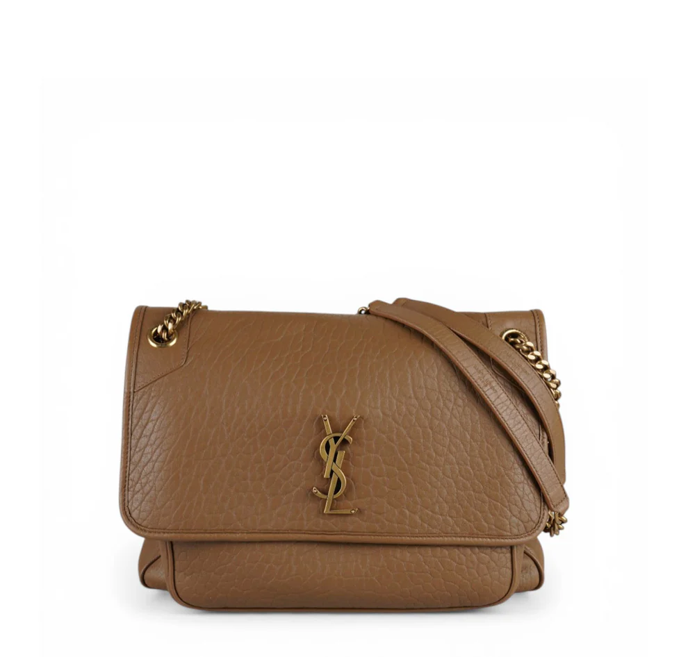 Iconica e sofisticata, la Saint Laurent Niki in misura Large è realizzata in pelle martellata nella ricercata tonalità Dark Cork (cammello), caratterizzata da un caldo sottotono ambrato. La struttura morbida e la patta frontale con chiusura magnetica sono impreziosite dall’inconfondibile logo YSL in metallo dorato, che aggiunge un tocco di eleganza senza tempo. La tracolla a catena con inserto in pelle consente una doppia portabilità, sia a spalla che crossbody, rendendola estremamente versatile. L’interno, foderato in tessuto nero, è dotato di pratiche tasche che la rendono ideale per l’uso quotidiano.
